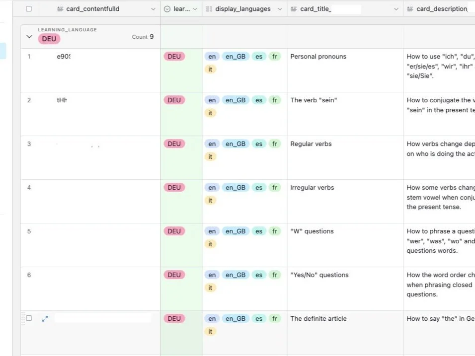 Besides publishing all the learning content, my team had the responsibility of documenting all the releases. This documentation supported the alignment with and enabled the work of other stakeholders. For example, product teams, customer service agents, or sales people who needed an overview of the display languages in which we offered a particular course or needed to understand how many lessons we had.